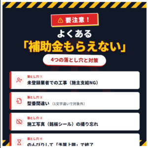 対策:秋口には予算がなくなるリスクがあります。検討は早めにし、手続きをスピーディーに進めてくれる信頼できる業者を選びましょう。
