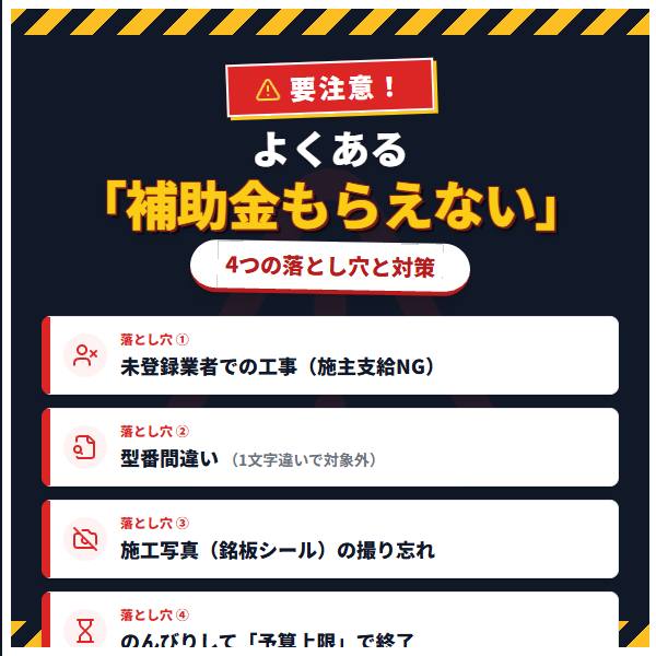 2026年の給湯省エネ事業は、過去最大級のお得な制度ですが、その分ルールも厳格です。「よくある補助金もらえない」という悲しい事態を避けるために、以下の3つのポイントを必ず守ってください。