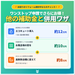 国は現在「住宅省エネ2026キャンペーン」を展開しており、給湯器だけでなく、窓や浴室の断熱リフォームの補助金も同時に申請できる**「ワンストップ申請」**が可能です。