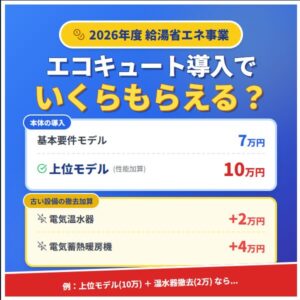 給湯省エネ2026事業の対象となっている**「昼間に沸き上げができるエコキュート(おひさまエコキュートなど)」**を導入すれば、このキャンペーンの恩恵を最大限に受けることができ、ポイントで実質的な節約になります。