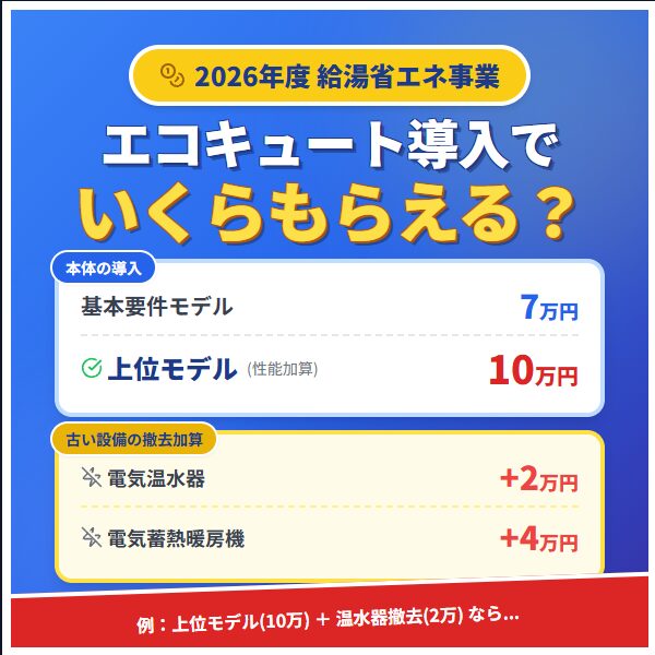 - 給湯省エネ2026事業: エコキュート導入+電気温水器撤去(約12万円)