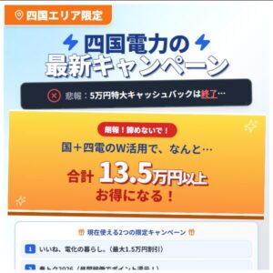 そして四国エリアの方は、3月までの5万円キャッシュバックが終わってしまったものの、現在進行形の**「電気代割引キャンペーン」や「昼間のポイント還元キャンペーン」**を活用することで、まだまだ圧倒的にお得に導入できるチャンスが続いています。