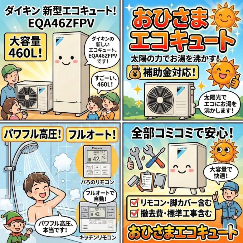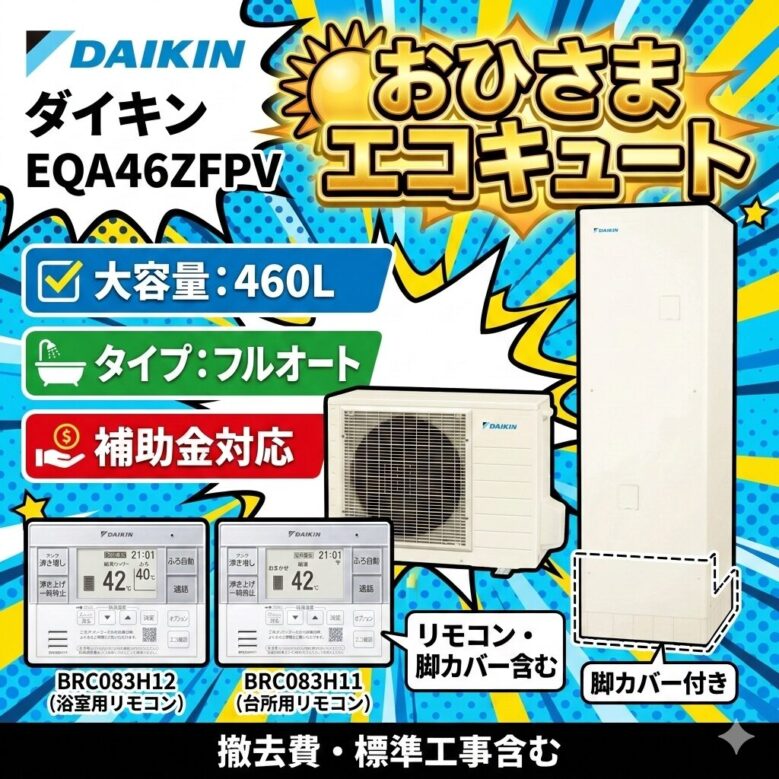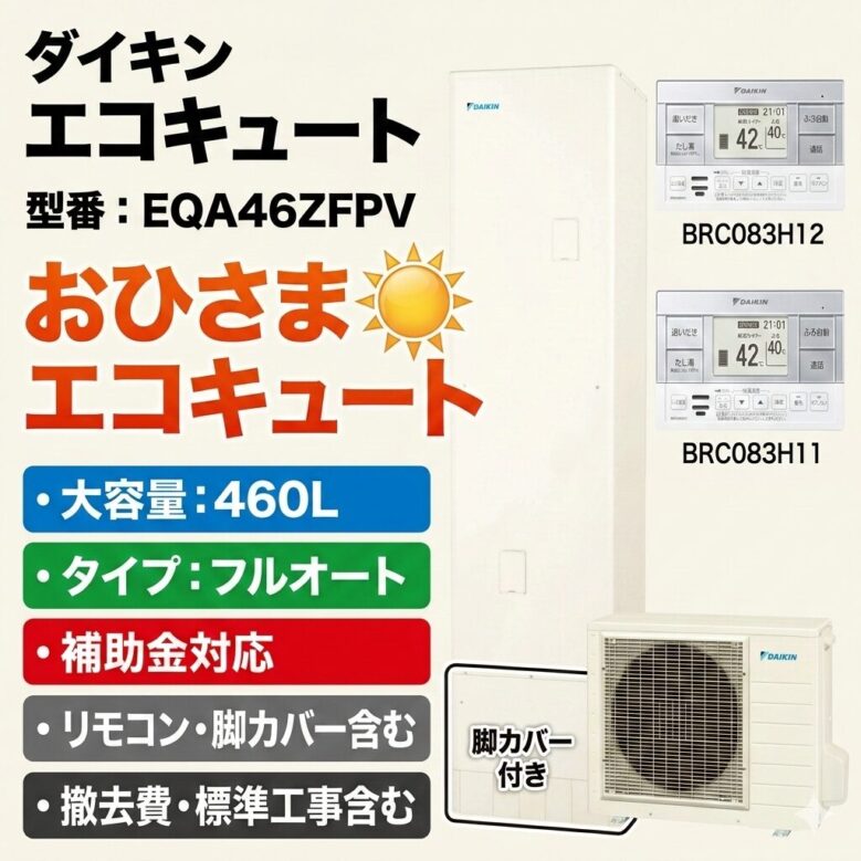 エコキュート標準交換工事コミ、補助金対象機種、四国電力昼トクeプラン対応、ダイキン EQA46ZFPV フルオート 角型 460L 4〜7人用 おひさまエコキュート パワフル高圧 一般地仕様 リモコン・脚部カバーセット