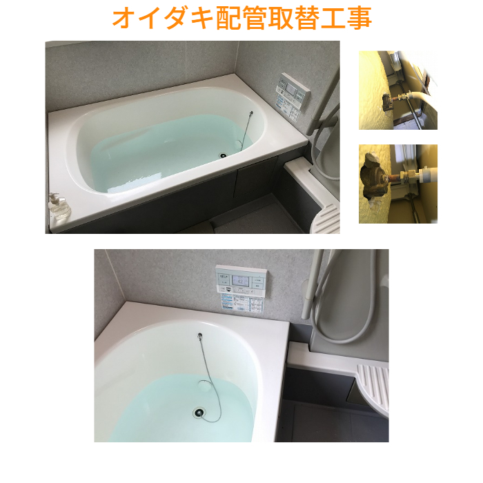 今回は温水器を撤去後、浴槽までのオイダキ配管を交換希望のため、既設配管を撤去します。また同時に浴槽の循環金具(循環アダプター)を新しいものに交換します。